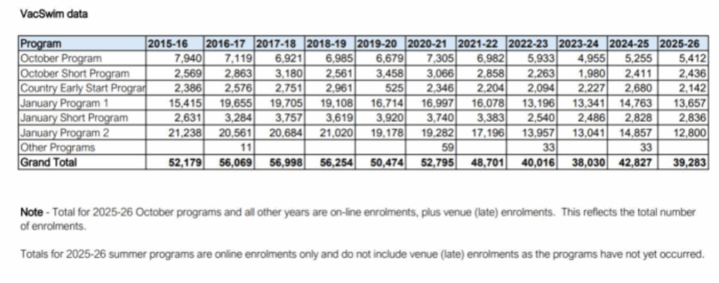 The declining VacSwim numbers follow the release of Royal Life Saving Australia’s 2025